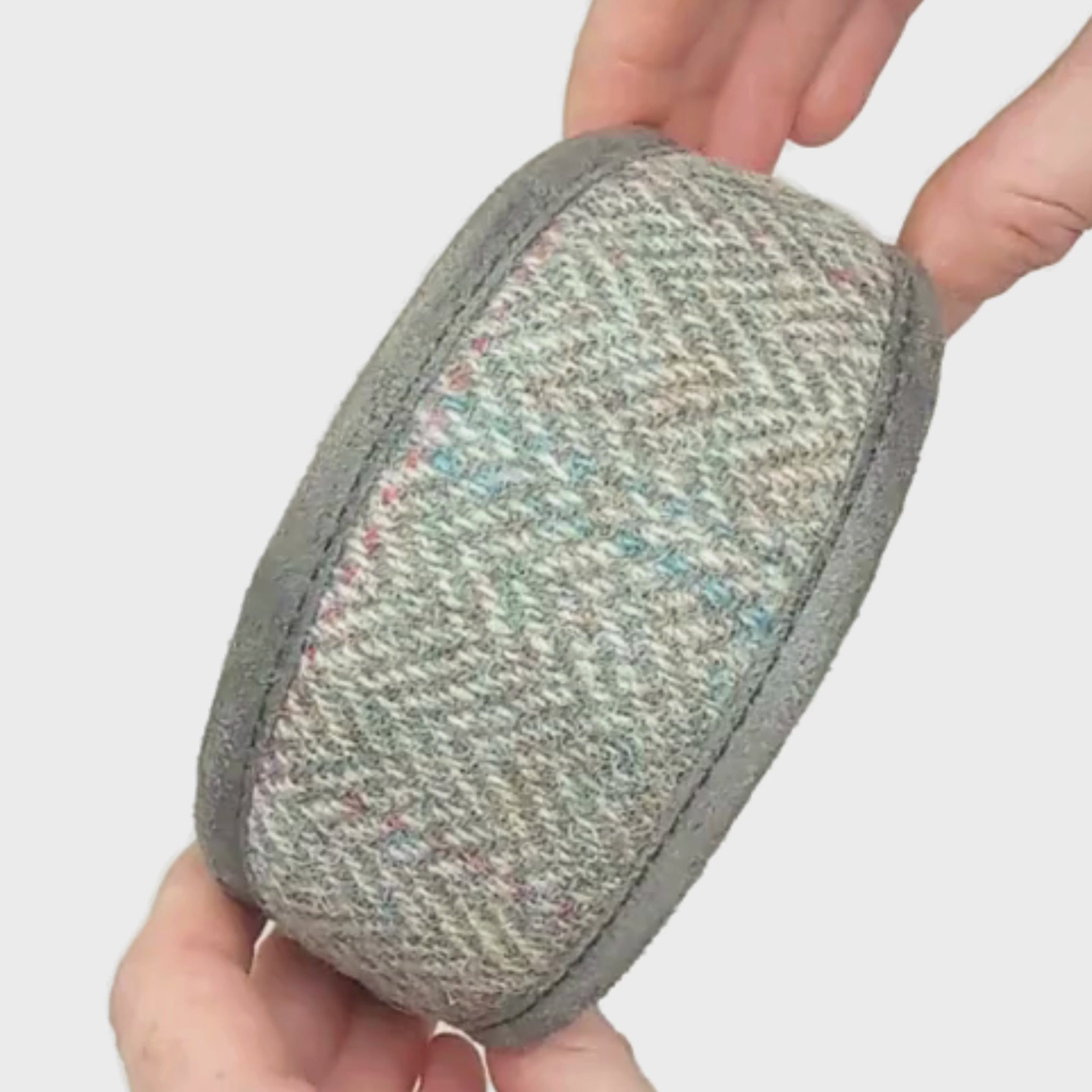 Harris Tweed collar in Neutral toned Duck Egg soft grey/blue Herringbone in 2 styles, a wider Hound width or Slim Fit. These collars have a padded, quilted inner and a luxury outer of genuine Harris Tweed fabric. Lined and edged in soft, colour matched suedette with a shape retaining inner core. All our collars are handmade to order, please refer to the size chart when ordering.